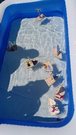 Schließlich musste die Fahrtüchtigkeit der gebastelten Boote bei einer Regatta im Planschbecken unter Beweis gestellt werden. Vor dem Abschluss ging es noch in den Wald und auf den Spielplatz, wo wir von den Küchenfeen noch einmal mit Eis überrascht wurden. Beim Abschied wurde von den Kindern der Wunsch geäußert, auch im nächsten Jahr wieder dabei sein zu wollen.