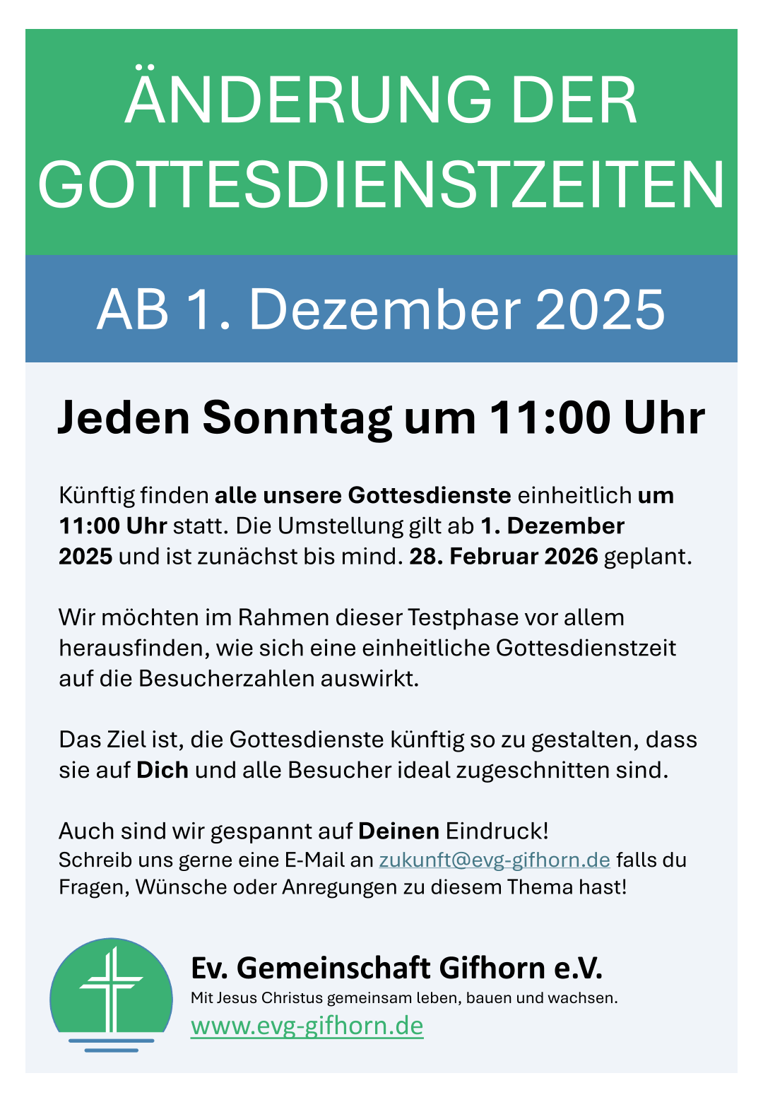 📢 Wichtige Änderung der Gottesdienstzeiten